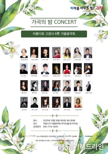 [경기헤드라인=김홍량 기자] 고양특례시가 후원하고, (사)한국예술문화단체총연합회 고양지회가 주최하며 (사)한국음악협회 고양지부가 주관하는 ‘2025 가곡의 밤 – 아름다운 고양시 8경(景) 가을 음악회’가 오는 16일 오후 7시 30분, 고양아람누리 아람음악당에서 개최된다.