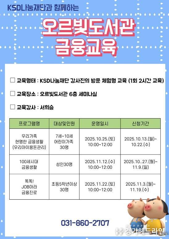 [경기헤드라인=김윤종 기자] 동두천시 도서문화사업소는 KSD나눔재단과 함께 10월 25일부터 11월 22일까지 오르빛도서관 6층 세미나실에서 세대별 맞춤형 금융교육 프로그램을 운영한다.