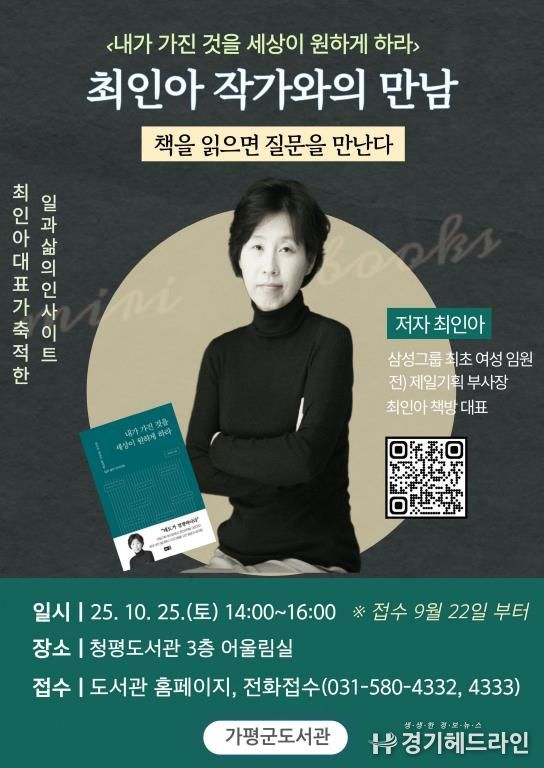 [경기헤드라인=문수철 기자] 가평군은 이달 25일 오후 2시 청평도서관에서 ‘2025년 정기 작가와의 만남’ 강연을 개최한다. 이번 강연은 ‘최인아 책방’ 대표로 잘 알려진 최인아 작가를 초청해 ‘책을 읽으면 질문을 만난다’를 주제로 열린다.
