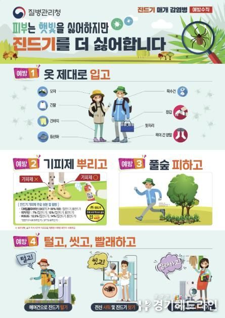 진드기 매개 감염병 예방을 위해서는 ▲야외 활동 시 진드기 기피제 사용 및 긴소매·긴바지·모자 등 착용으로 피부 노출 최소화 ▲야외활동 후 즉시 샤워 및 옷 갈아입기 ▲얼굴, 귀, 몸통 등에 진드기 부착 여부 확인 등의 수칙을 지켜야 한다.