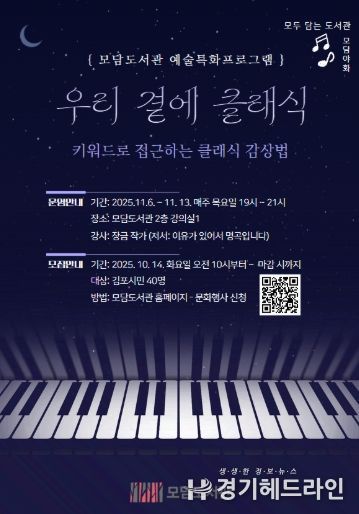 [경기헤드라인=문수철 기자] 김포시 모담도서관은 클래식을 주제로 11월 6일부터 13일까지 매주 목요일 오후 7시부터 9시까지 특별 강연을 운영한다.