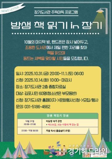 [경기헤드라인=문수철 기자] 김포시 장기도서관은 주독야독 프로그램인 '밤샘 책 읽기 인(in) 장기'를 10월 31일 오후 8시부터 11월 1일 오전 6시까지 장기도서관에서 진행한다고 밝혔다.