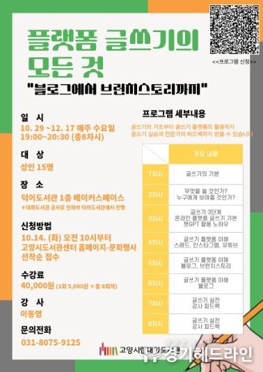 [경기헤드라인=김홍량 기자] 고양특례시 대화도서관에서는 글쓰기의 기초부터 글쓰기 플랫폼의 활용까지 배워볼 수 있는 독서문화 프로그램‘플랫폼 글쓰기의 모든 것’을 10월 29일부터 운영한다.