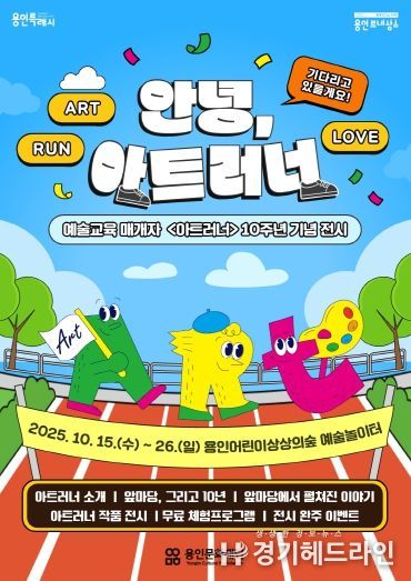 [경기헤드라인=문수철 기자] (재)용인문화재단은 예술교육 매개자 ‘아트러너(Art Runner)’ 사업 10주년을 맞아 오는 10월 15일부터 26일까지 용인어린이상상의숲 예술놀이터에서 기념 전시 '안녕, 아트러너'를 개최한다.