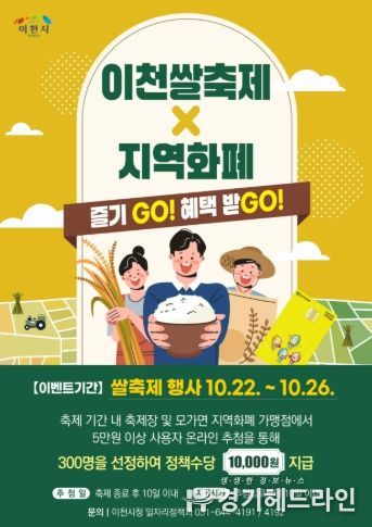 [경기헤드라인=정현수 기자] 이천시는 2025 이천쌀문화축제 기간에 지역화폐 이용을 촉진하고 지역경제를 활성화하기 위해 코나아이(주)의 경기지역화폐 사회공헌 재원을 활용하여 ‘이천쌀축제, 지역화폐로 즐기고(GO), 혜택받고(GO)’ 이벤트를 추진한다고 밝혔다.