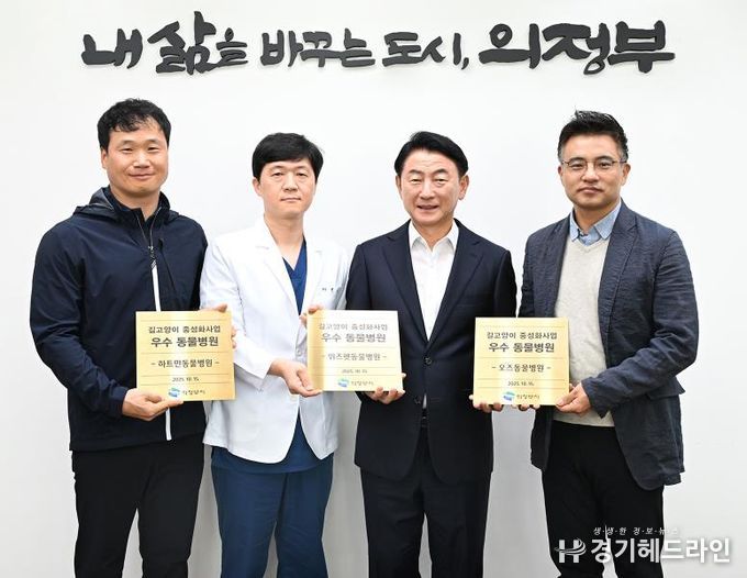 [경기헤드라인=문수철 기자] 의정부시는 10월 15일 시장실에서 ‘길고양이 중성화사업 우수 동물병원’ 인증패 전달식을 열고, 사업에 적극 참여해 지역 동물복지 문화 확산에 기여한 동물병원을 격려했다.
