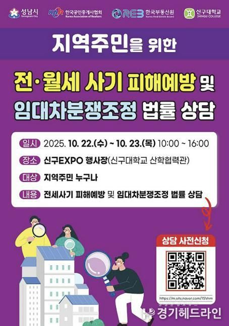 [경기헤드라인=문수철 기자] 성남시는 오는 10월 22일부터 23일까지 양일간 오전 10시부터 오후 4시까지 신구대학교 신구EXPO 행사장에서 ‘전세사기 피해예방 상담 부스’를 운영한다.