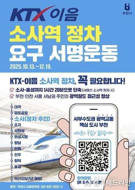 조용익 부천시장은 “KTX-이음 소사역 정차는 단순한 교통 개선을 넘어, 서해선 시대에 부천이 수도권 서남부의 중심으로 도약할 수 있는 계기”라며 “시민의 서명 하나하나가 소중한 힘이 되는 만큼 많은 참여를 바란다”고 말했다.
