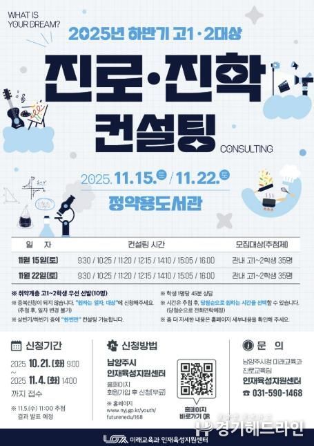 [경기헤드라인=문수철 기자] 남양주시는 오는 21일부터 ‘2025년 하반기 진로·진학 컨설팅’참가자를 모집한다고 밝혔다.