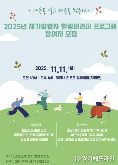 [경기헤드라인=문수철 기자] 양평군은 재가암환자와 그 가족을 대상으로 ‘2025년 재가암환자 힐링테라피 프로그램’ 대상자를 모집한다고 밝혔다. 프로그램은 오는 11월 11일, 양평 미리내 리조트 내 힐빙클럽에서 진행될 예정이며, 총 20명을 모집한다.