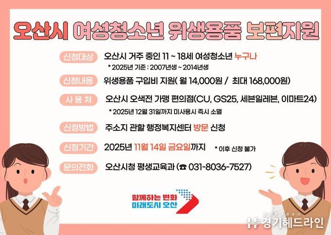[경기헤드라인=문수철 기자] 오산시는 여성청소년의 건강권 보장과 보편적 복지 실현을 위해 올해 처음 시행한 ‘여성청소년 위생용품 보편지원사업’의 신청을 오는 11월 14일 마감한다. 아직 신청하지 않은 대상자는 혜택을 받을 수 있도록 서둘러 참여해야 한다.