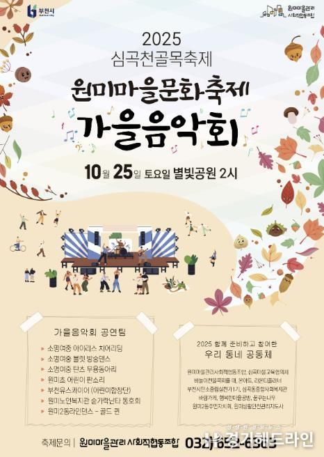 [경기헤드라인=문수철 기자] 부천시는 10월 25일 원미별마루와 별빛공원 일대(부천로 90번길 51)에서 ‘2025년 심곡천 골목축제–원미마을문화축제 가을 음악회’를 연다. 이번 행사는 부천시 원도심재생과가 주최하고, 원미마을관리사회적협동조합이 주관한다.