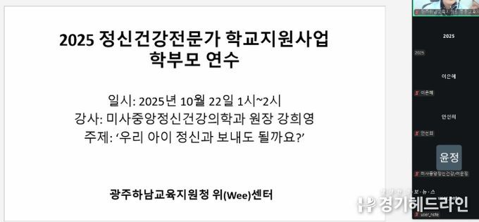 [경기헤드라인=정현수 기자] 광주하남교육지원청 위(Wee)센터는 10월 22일 관내 초·중·고 학부모 130여 명을 대상으로 ‘우리 아이 정신과 가도 될까요? 정신과에 대한 올바른 이해와 편견 해소’를 주제로 비대면 부모 교육을 진행했다.