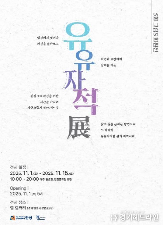 [경기헤드라인=문수철 기자] 안성천 우리동네 작은미술관 결갤러리에서는 오는 11월 1일부터 15일까지 그림스아뜰리에 제5회 회원전 ‘유유자적’이 열린다. 이번 전시는 바쁜 일상 속에서 잠시 걸음을 멈추고, 자연과 교감하듯 마음을 산책하는 여유의 시간을 주제로 마련됐다.