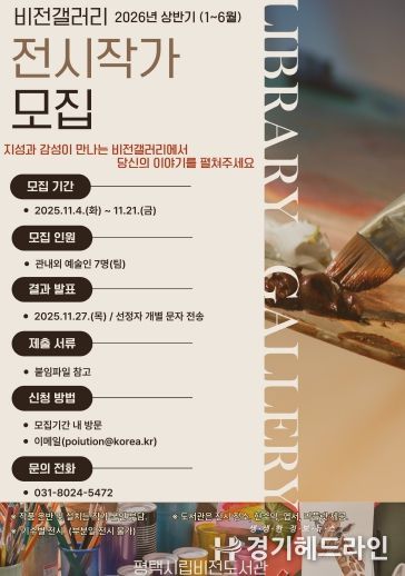 [경기헤드라인=문수철 기자] 평택시립 비전도서관에서는 관내․외 예술가와 신진 작가에게 폭넓은 전시 기회를 제공하고, 시민들이 예술을 보다 가까이에서 누릴 수 있는 기회를 제공하고자 오는 11월 4일부터 21일까지 2026년 상반기 비전갤러리 전시 작가를 모집한다.