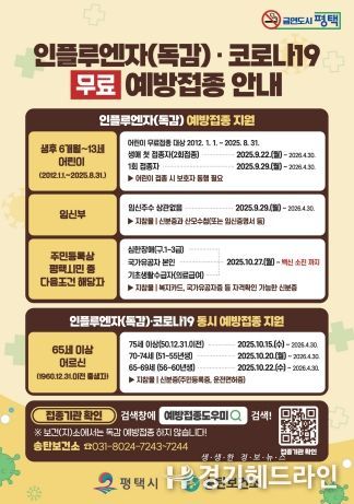 주민등록상 평택시민 중 심한장애인, 의료급여수급자 또는 국가유공자는 10월 27일부터 무료 예방접종을 실시하고 있다.