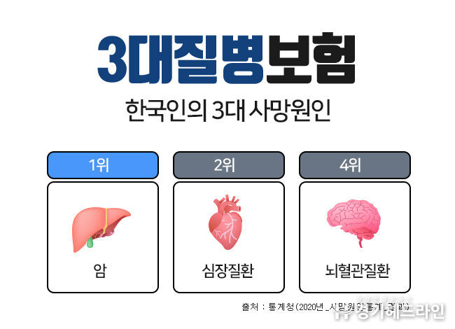 [경기헤드라인=] 흔히 3대질병이라 일컫는 암, 심혈관질환, 뇌혈관질환은 통계청 발표자료에 따르면 한국인의 주요 사망원인 중에서 3위 폐렴을 제외하고 1~4위를 차지하고 있으며, 이전부터 지금까지도 살면서 가장 먼저 대비해야 하는 치명적인 질병으로 강조되고 있다. 이러한 중대질병에 대비하기 위하여 상기 세가지 치명적인 질병을 집중보장하는 3대질병진단비보험을 많이 가입하고 있다. 3대진단비보험은 각각의 질병을 중점적으로 보장하면서도 가입자 특성에 맞는 특약을 추가함으로써 종합건강보험으로도 활용할 수가 있다.