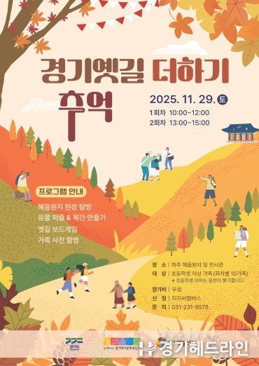 [경기헤드라인=문수철 기자] 경기문화재단 경기역사문화유산원는 오는 11월 29일 토요일, 의주길에 위치한 파주 혜음원지 일대에서 초등학생 이상 자녀를 둔 가족을 대상으로 하는 역사 체험 프로그램 ‘경기옛길 더하기 추억’을 개최한다고 밝혔다.