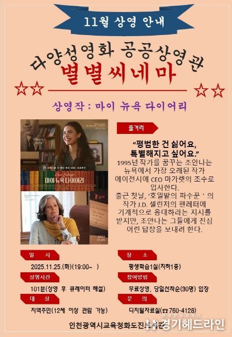 [경기헤드라인=문수철 기자] 인천광역시교육청화도진도서관은 시민들의 영상문화 향유 기회를 확대하고자 운영 중인 다양성영화 공공상영관 ‘별별씨네마’를 오는 11월 25일 오후 7시, 화도진도서관 평생학습1실에서 진행한다고 밝혔다.