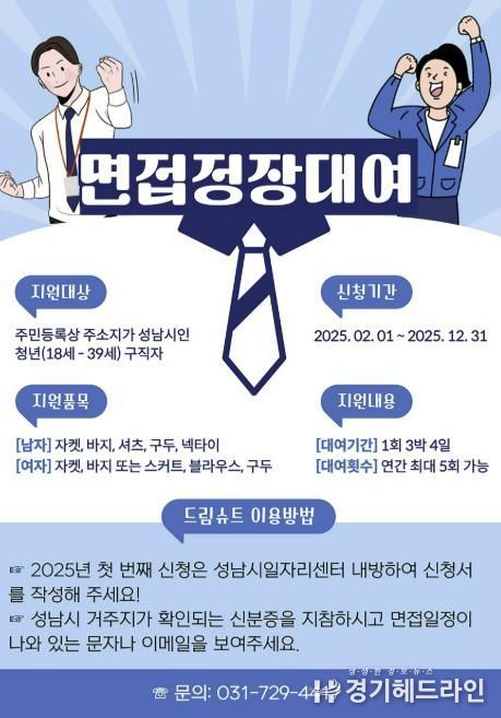 [경기헤드라인=문수철 기자] 성남시는 사회에 첫발을 내딛는 청년 구직자의 취업 준비를 지원하고 경제적 부담을 덜어주기 위해 ‘청년 면접정장 무료 대여사업’을 확대 실시한다.