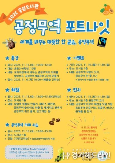 [경기헤드라인=문수철 기자] 성남도시개발공사 중원도서관은 오는 11월 15일부터 11월 30일까지 ‘2025 공정무역 포트나잇(Fair Trade Fortnight)’ 행사를 운영한다고 13일 밝혔다.