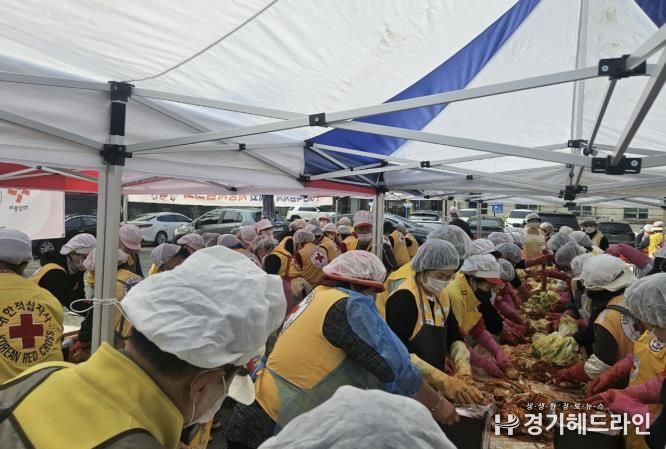 [경기헤드라인=문수철 기자] 대한적십자사 시흥시협의회는 지난 11월 13일 ‘사랑의 김장 담기’ 행사를 열고 지역 내 소외된 이웃들에게 온정을 전했다. 이번 행사에는 대한적십자사 시흥시협의회 봉사원 100여 명이 참여해 정성껏 김장김치를 담갔으며, 완성된 김치는 관내 저소득가정 등 약 300가구에 전달됐다.