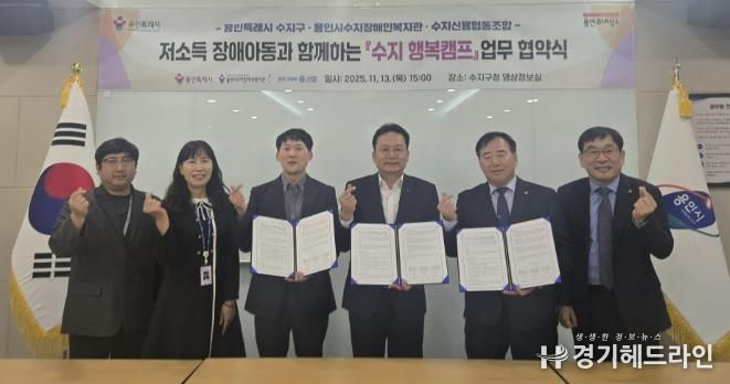 [경기헤드라인=문수철 기자] 용인특례시 수지구는 13일 용인시수지장애인복지관과 수지신용협동조합과 함께 저소득 장애아동의 복지 향상과 장애 인식 개선을 위한 ‘수지 행복캠프’ 추진 업무협약을 체결했다고 14일 밝혔다.