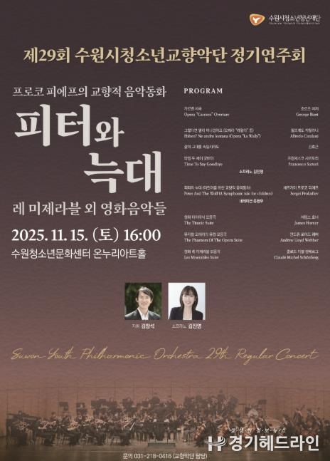 [경기헤드라인=문수철 기자] 수원시청소년청년재단 수원청소년문화센터에서는 오는 11월 15일 오후4시, 온누리아트홀에서 제29회 정기연주회를 개최한다. 이번 연주회는 ‘프로코 피에프의 교향적 음악동화 '피터와 늑대'’를 중심으로, 세대를 아우르는 감동의 영화음악을 함께 선보이며 청소년 단원들의 풍성한 음악적 성장을 보여줄 예정이다.