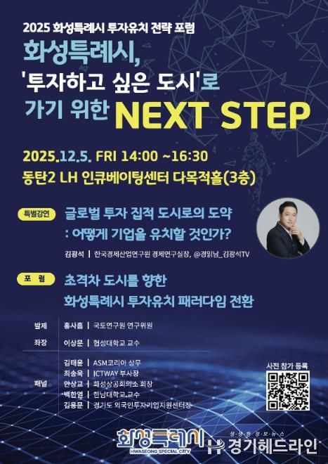 [경기헤드라인=문수철 기자] 화성특례시가 ‘2025 화성특례시 투자유치 전략 포럼’을 다음 달 5일 동탄2 인큐베이팅센터 다목적홀에서 개최한다.