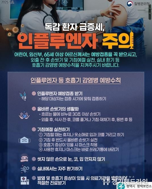 [경기헤드라인=문수철 기자] 평택시는 이번 觝-觞절기 인플루엔자 유행이 예년보다 이르게 시작됨에 따라, 감염병 확산 방지를 위해 예방접종 참여 및 마스크 착용 등 기본적인 예방수칙 준수를 시민들에게 당부했다.