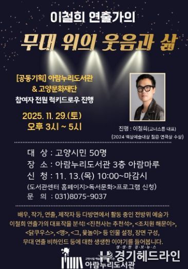 [경기헤드라인=김홍량 기자] 고양특례시 아람누리도서관은 오는 29일 오후 3시, 2024년 제60회 백상예술대상 젊은 연극상 수상자인 이철희 연출가를 초청해 예술특성화 프로그램 ‘무대 위의 웃음과 삶’을 운영한다.