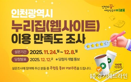 인천시는 설문조사에 참여한 시민들 중 100명을 추첨하여 모바일 음료 쿠폰을 지급할 예정이며, 당첨자 발표는 12월 12일 인천시 대표 누리집 공지사항에 게시하고 개별 문자를 통해서도 안내될 예정이다.