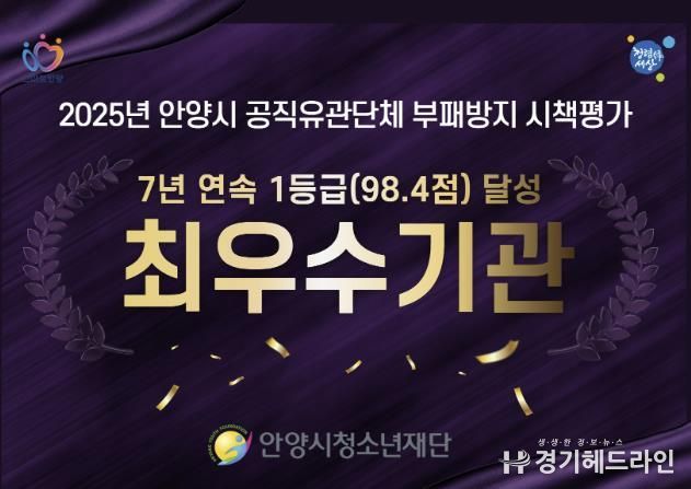 [경기헤드라인=문수철 기자] 안양시청소년재단이 2025년 안양시 공직유관단체 부패방지 시책평가에서 7년 연속 최우수기관으로 선정됐다. 재단은 이번 평가에서 총점 98.4점이라는 높은 점수를 획득하며, 안양시 7개 공직유관단체 중 최고 수준의 청렴도와 투명성을 다시 한번 입증했다.