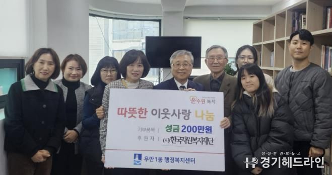 [경기헤드라인=문수철 기자] 수원시 팔달구 우만1동은 지난 24일, 사단법인 한국자원복지재단 사무실에서 관내 취약계층 지원과 복지사각지대 해소를 위해 활용될 성금 200만 원을 전달받았다.