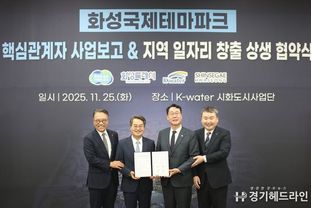 이날 김 지사는 정명근 화성시장, 임영록 신세계그룹 사장, 안정호 K-water 그린인프라부문장과 ‘화성 국제테마파크 지역 일자리 창출 및 상생협력 업무협약’을 체결했다.