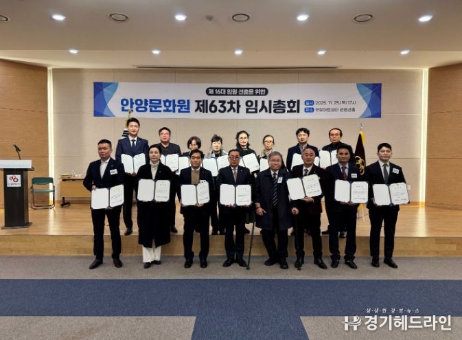 [경기헤드라인=문수철 기자] 안양문화원은 지난 25일 오후 5시 안양아트센터 컨벤션홀에서 제63차 임시총회를 열고 임기 만료(2025.12.26.)에 따른 제16대 원장 및 임원 선출을 진행했다. 이번 임시총회는 정관에 따른 성원이 충족되어 개회됐으며, 원장·부원장·이사·감사에 대한 선출 절차가 공정한 절차에 따라 실시됐다.