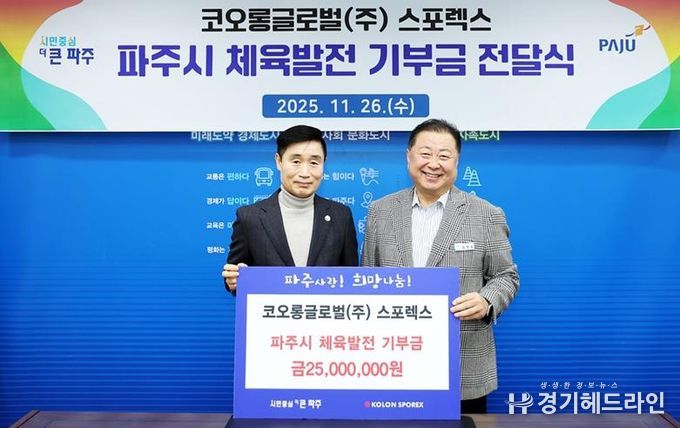 [경기헤드라인=김홍량 기자] 파주시는 코오롱글로벌㈜이 지난 26일 파주시 체육 발전을 위한 기부금 2천5백만 원을 전달했다고 밝혔다.