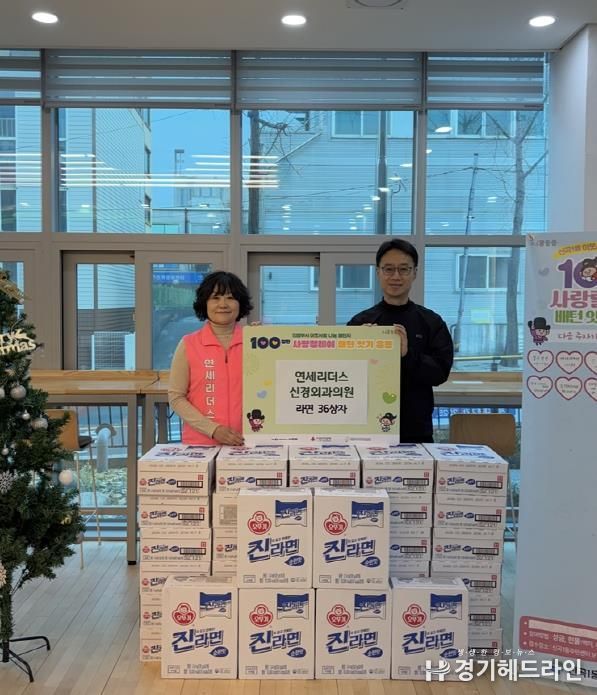 [경기헤드라인=문수철 기자] 의정부시 신곡1동주민센터는 11월 27일 연세리더스신경외과의원이 저소득 취약계층을 돕기 위해 라면 36상자를 기탁하며 ‘100일간 사랑릴레이 배턴 잇기’에 동참했다고 밝혔다.