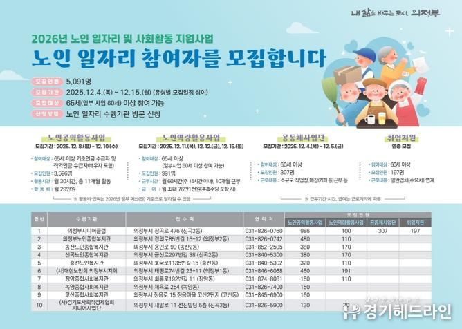 [경기헤드라인=문수철 기자] 의정부시는 12월 4일부터 15일까지 ‘2026년 노인 일자리 및 사회활동 지원사업’ 참여자 5천91명을 모집한다.