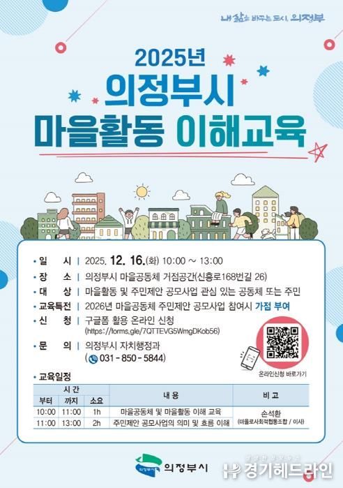 [경기헤드라인=문수철 기자] 의정부시는 12월 16일 의정부시 마을공동체 거점공간(신흥로168번길 26)에서 마을공동체에 대한 시민들의 참여 확대와 지속적인 관심을 유도하기 위한 ‘2025년 마을활동 이해교육’을 운영한다.