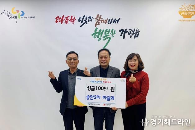 [경기헤드라인=문수철 기자] 가평군 가평읍 승안2리 마을회가 최근 가평읍 행정복지센터을 찾아 취약계층 지원을 위한 성금 1백만 원을 전달했다.