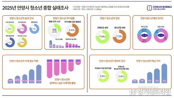 [경기헤드라인=문수철 기자] 안양시청소년재단은 5일 관내 초등학교 4학년부터 고등학교 3학년까지 재학 중인 청소년 2,782명과 학교 밖 청소년 53명을 대상으로 실시한 ‘2025년 안양시 청소년 종합 실태조사’ 결과를 발표했다.