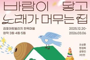[경기헤드라인=문수철 기자] (재)김포문화재단은 연말연시를 맞아 가족의 온기와 새해의 희망을 담은 하반기 기획전시 '바람이 닿고 노래가 머무는 집'을 12월 20일부터 2026년 3월 6일까지 김포아트빌리지 한옥마을 창작 3·4·5동에서 개최한다고 밝혔다.