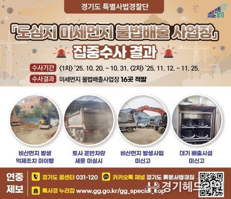 [경기헤드라인=문수철 기자] 경기도는 도심지 미세먼지 발생사업장 330개를 대상으로 불법 배출 행위를 집중 수사해 대기환경보전법 위반 사업장 16개를 적발했다고 9일 밝혔다.