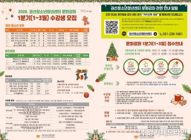 [경기헤드라인=문수철 기자] 수원시청소년청년재단 권선청소년청년센터는 오는 1월 6일부터 3월 27일까지 지역사회 평생학습 문화강좌 1분기(1~3월) 수강생을 모집한다.
