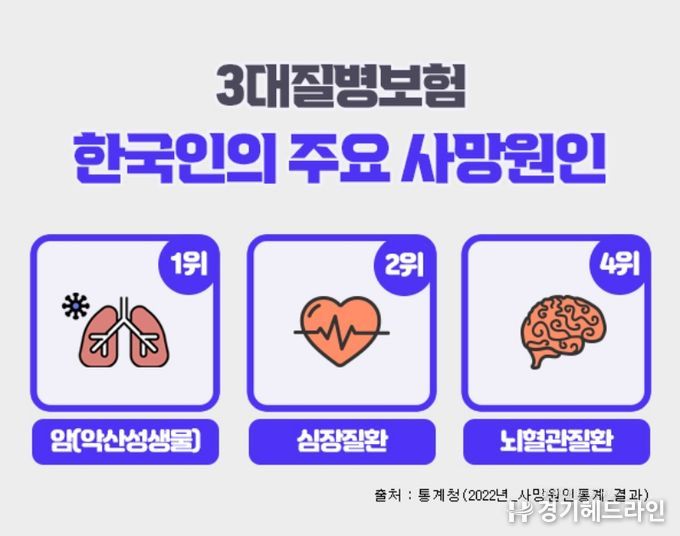 [경기헤드라인=] 흔히 3대질병이라 일컫는 암, 심혈관질환, 뇌혈관질환은 통계청 발표자료에 따르면 한국인의 주요 사망원인 중에서 3위 폐렴을 제외하고 1~4위를 차지하고 있으며, 이전부터 지금까지도 살면서 가장 먼저 대비해야 하는 치명적인 질병으로 강조되고 있다. 이러한 중대질병에 대비하기 위하여 상기 세가지 치명적인 질병을 집중보장하는 3대질병진단비보험을 많이 가입하고 있다. 3대진단비보험은 각각의 질병을 중점적으로 보장하면서도 가입자 특성에 맞는 특약을 추가함으로써 종합건강보험으로도 활용할 수가 있다.