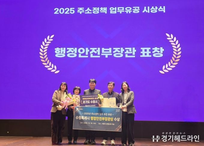 [경기헤드라인=문수철 기자] 수원특례시가 행정안전부 주관 ‘2025 주소정책 워크숍’에서 ‘2025 주소정책 업무 분야 우수기관’으로 선정돼 행정안전부 장관 표창을 받았다. 특별교부세 4000만 원도 확보했다.