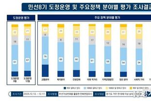 정책 분야별 평가 결과, 교통 분야 긍정 평가가 76%로 가장 높게 나타났으며, 민생경제와 복지 분야는 각각 66%, 미래먹거리 분야는 61%로 집계됐다. 지역균형발전 58%, 기후위기 대응과 청년 분야는 각각 54%, 사회적 가치 분야는 53%였으며, 주거 분야도 52%로 긍정 평가가 과반을 기록했다.