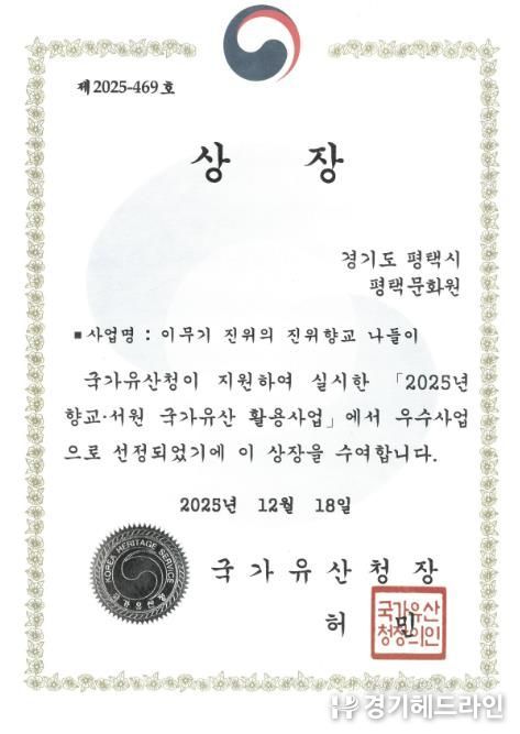 [경기헤드라인=문수철 기자] 평택문화원은 12월 18일 대전 전통나래관 다목적강당에서 열린 국가유산청 주최 ‘2025 우리고장 국가유산 활용 우수사업 시상식’에서 평택문화원의 ‘이무기 진위의 진위향교 나들이’가 우수사업(국가유산청장상)으로 수상했다.