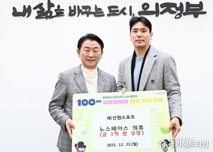 [경기헤드라인=문수철 기자] 의정부시는 12월 22일 ㈜신원스포츠 노스페이스 양주점(LF스퀘어몰)과 포천송우점이 관내 아동복지시설에 아동용 의류 및 가방 등 1억 원 상당의 물품을 기부했다고 밝혔다.